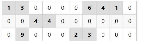 Khu vực chứa nhiệm vụ được mã hóa thành các hình chữ nhật có kích thước ~1 \times k~ ~(k <= N)~ chứa các số khác ~0~, khu vực không chứa nhiệm vụ được mã hóa bằng số ~0~. Biết rằng các khu vực chứa nhiệm vụ không liền sát nhau. Độ khó của một nhiệm vụ được xác định bằng tổng các số trong các ô của khu vực đặt nhiệm vụ đó.