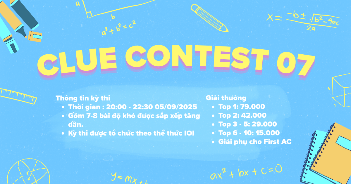 Vậy là một năm học mới đã đến, mang theo nhiều hoài bão tuổi trẻ, những ước mơ và những câu chuyện sắp thành hiện thực. Để chung vui ngày này với biết bao học sinh khác, chúng mình quyết định tổ chức Clue Contest 07 - Contest năm học mới với hy vọng các bạn sẽ có một khởi đầu thật suôn sẻ trước khi thi các cuộc thi mà các bạn sắp phải đối đầu trong tương lai.
